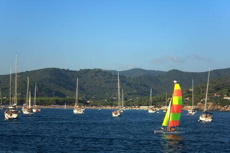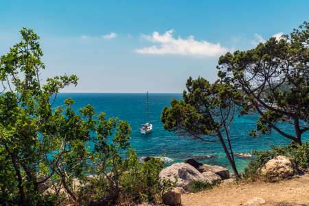 Two yahts floating near the scenic landscape of Cala Violina beach in Tyrrhenian Sea bay surrounded by green forest in province of Grosseto in Tuscany, Italy