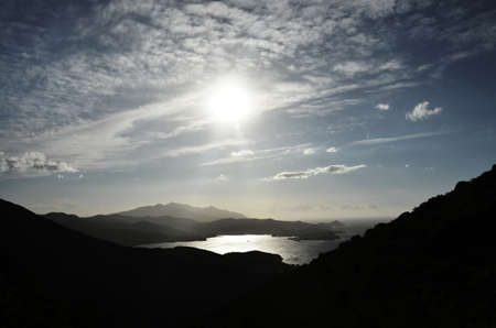 Beautiful view of the sunset and the natural landscape with the sea and hills or mountains in Montenegro.