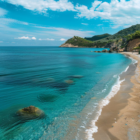 Secluded cove along the Wild Coast with rugged cliffs and blue sea, copy space
