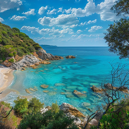 Mediterranean Greek landscape beach drone shot. Aerial top view of Sithonia Chalkidiki peninsula above rocky coastal with green plantation and crystal-clear waters.