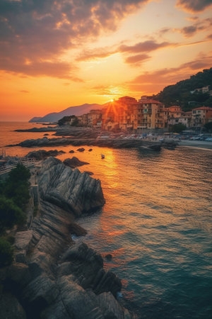 Generative AI : Beautiful Small Mediterranean City after sunset with colorful illumination Camogli Italy European travel