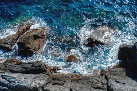 Coastline with cliff mountain and seashore view. Pitched rock face on the sea. Elba island in Italy. Aerial view. Green vegetation.
