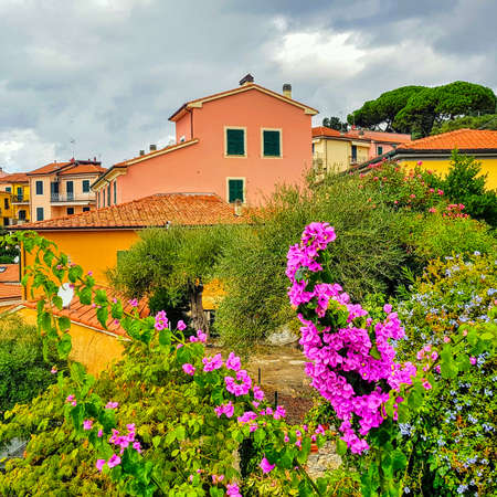 Bougainvillea flowers with colorful architecture of small fishing village in background - Tellaro, Cinque Terre, Liguria, Italy