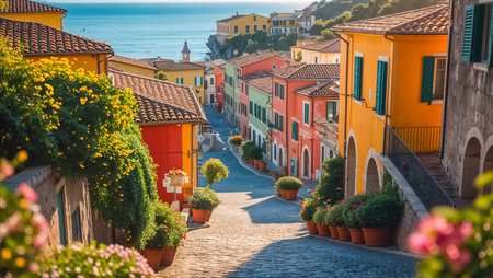 Street lined with plants in flowerpots in small Italian town of Orbetello. People walking the Italian street. All faces and trademarks are blurred