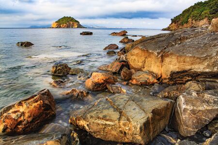 Greek mediterranean sea coast at sunrise in Macedonia, Greece