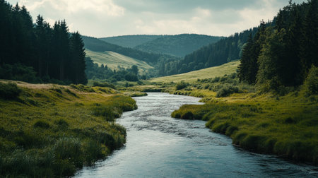 Babbling stream in a European countryside, surrounded by rolling hills, with space for copy.