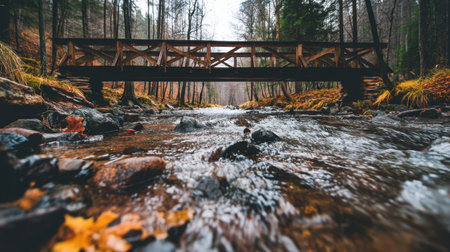 Serene wooden bridge spans gentle stream, surrounded by autumn foliage and tall trees. water flows smoothly over rocks, creating peaceful atmosphere in nature