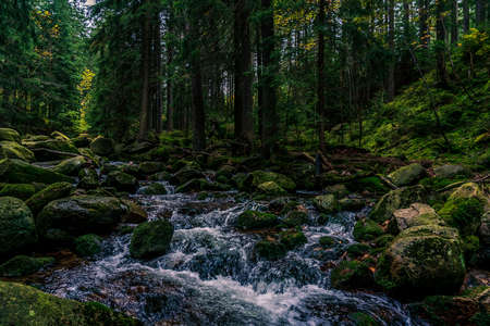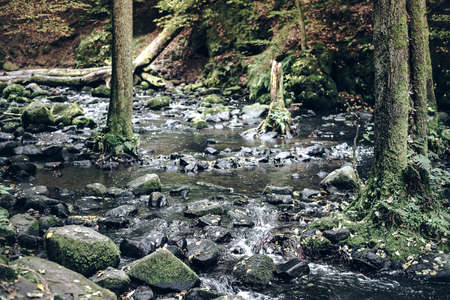 Mountain creek stream flowing through the autumn forest