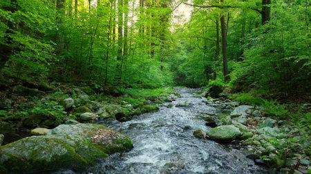 Serene summer landscape stream flowing through mossy stones and lush green forest trees