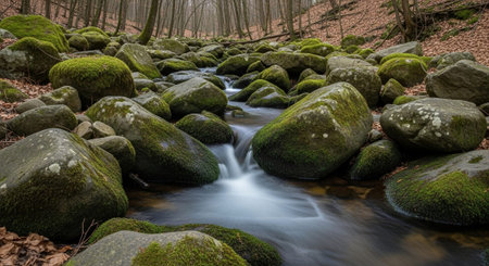 Mossy boulders in the forest with a stream flowing through