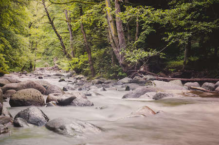 Fast mountain river in rapid flow in the green forest