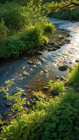 A serene view of a peaceful stream featuring smooth river rocks, surrounded by nature. The scene captures the tranquil flow of water under soft sunlight.