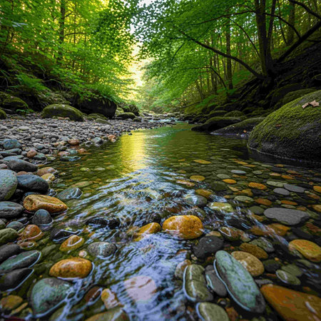 A tranquil stream flows through a dense forest, reflecting the surrounding trees and sunlight. The scene is dominated by shades of green and brown, with water creating a sense of movement. Suitable for environmental themes, it has commercial and editorial applications to illustrate nature.
