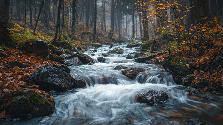 A tranquil stream flows gently through a vibrant autumn forest. Golden leaves and moss-covered rocks create a peaceful atmosphere, highlighting nature's beauty.