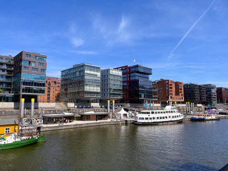 Hamburg, Germany, May 11, 2019: Hamburg city canal and modern buildings, Hafencity in Hamburg, Germany