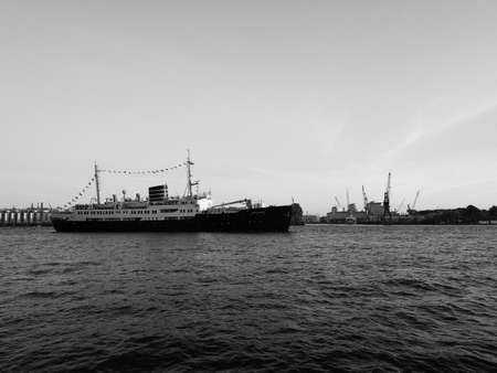 HAMBURG, GERMANY - CIRCA MAY 2017: Hamburger Hafen (Port of Hamburg) sea port on the river Elbe in black and white