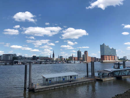 Hamburg horbor waterfront cityscape with Elbe river and St. Pauli Piers on sunny day