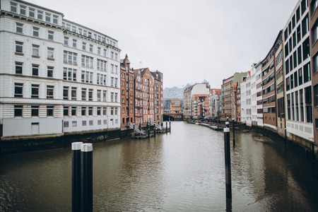 buildings and channel in the old warehouse district in Hamburg, Germany
