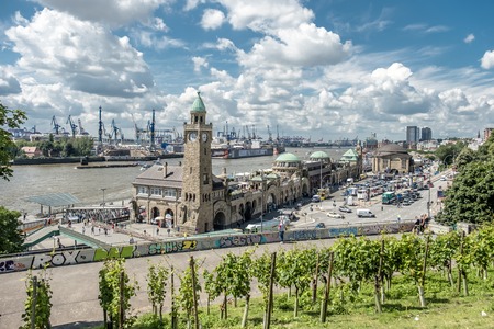 HAMBURG, GERMANY - April 18, 2018: St Pauli Landungsbrucken landing place in Port of Hamburg between the lower harbour and Fish Market on Elbe river