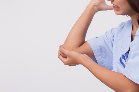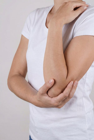 woman suffering from elbow joint pain, rheumatoid or gout arthritis