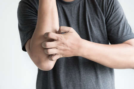 Dermatitis, eczema, allergy, psoriasis concept. man scratching itch on his arm, grey studio background. man itching rash on his elbow, copy space