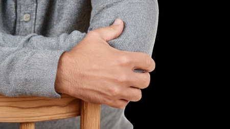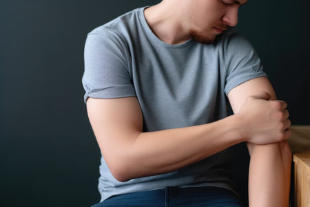 Man soothing forearm tension, minimalist backdrop. Concept Massage techniques, Self-care, Body relaxation, Mindfulness meditation