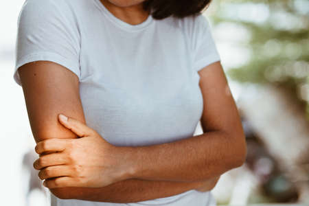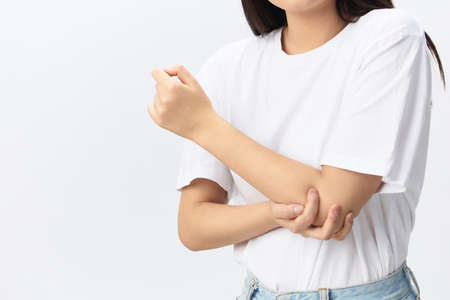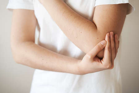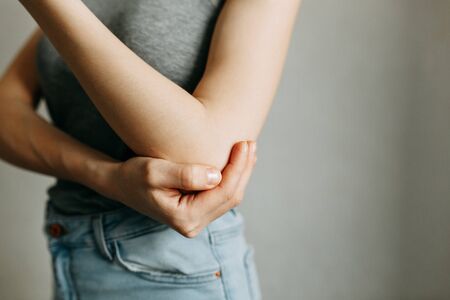 Woman is touching her elbow. Elbow pain.Pain concept. Health care and medical concept.