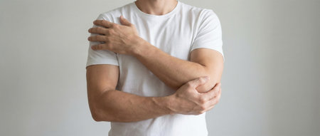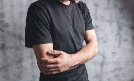 Man holding elbow on gray background possibly due to pinched nerve or injury - Exploring potential causes. Concept Pinched Nerve, Elbow Pain, Injury Causes, Arm Discomfort, Gray Background