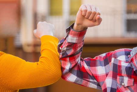 Dont shake hands. Stop handshakes. Elbow bump. Bump elbows. Friends shaking elbows outdoors. Elbow greeting style. Coronavirus epidemic
