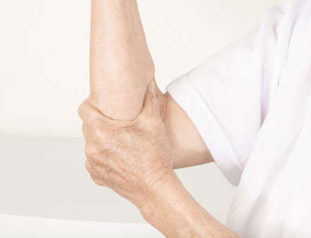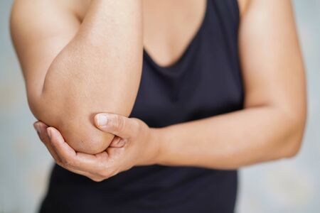 Asian middle-aged lady woman patient touch and feel pain her elbow and arm : healthy medical concept.