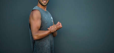 Young healthy powerful athlete with strong biceps standing on gray background