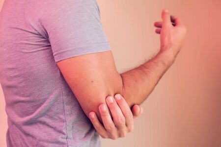 Elbow pain. The man's elbow hurts.