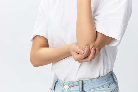 pain in the elbow joint, the girl holds on to her elbow on a white background