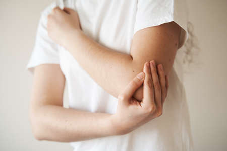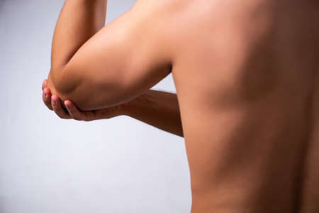 Man suffering from elbow pain, close-up. Health care concept