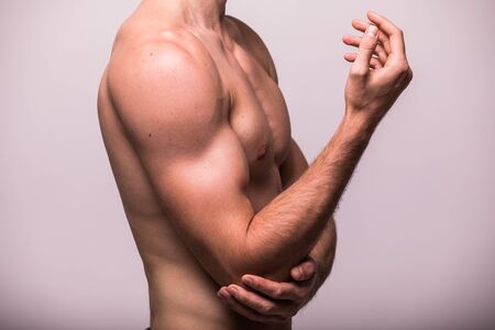 The man pains elbow. These symptoms may cause by sport, hard work with arm. Close up shot.