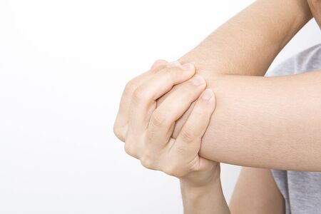 The man holds the elbow due to acute pain