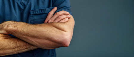 Close up of man arms crossed over his chest, showcasing muscular hands and black t shirt against textured gray background. image conveys sense of confidence and strength