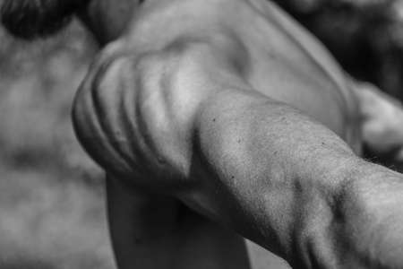 Male hands close-up Black and white image of a muscular man, athletic body, beautiful masculine forms of muscles, relief. Beautiful strong and flexible body, sexy attractive.