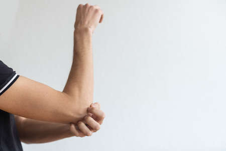 Young man suffering with elbow pain.Office syndrome Concept.Health concept.copy space for text.