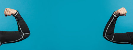 Strong arm of bodybuilder athlete with big biceps triceps visible veins muscular physique on gray background