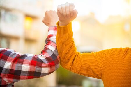 Dont shake hands. Stop handshakes. Elbow bump. Bump elbows. Friends shaking elbows outdoors. Elbow greeting style. Coronavirus epidemic