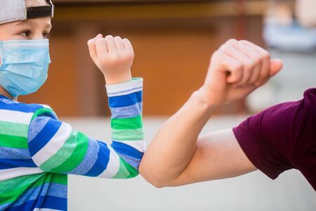 Coronavirus outbreak. Protective measures. Mask friends, bump elbows. Father and son bump elbows outdoors. Coronavirus quarantine. Social distancing concept