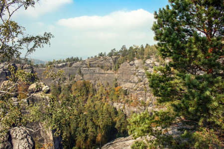 view on the rocks and the autumn forest around, National park Tiské stěny, Czech republic,