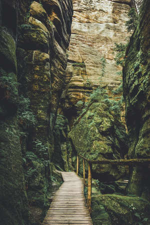 Prachov rock town - Prachovske Skaly in the region of Bohemian Paradise in the Czech Republic. Beautiful tower rocks in the forest . Cloudy weather. Climbing and hiking training.