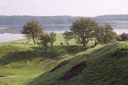 Cattle in the field at the ruined castle at Kalo near Aarhus, Denmark