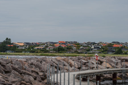 Colorful coastal village of Molle with scenic harbor and dramatic sea view on a cloudy day in Sweden.