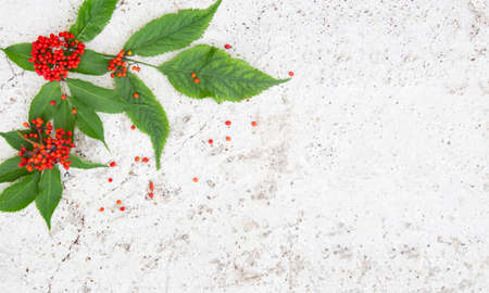 Sambucus. Fresh elderberry branch and green leaves isolated on a white background, top view.