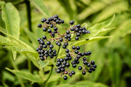 Black berries of elderberry in forest in nature. Medicinal plants, cold treatment, covid