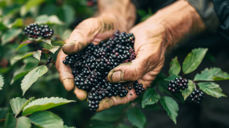 Fresh Elderberry fruits. Ripe Elderberry in hand