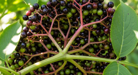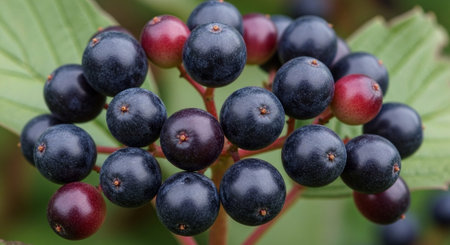 A close up of a leafy plant with a cluster of berries on it. The berries are dark and shiny, and the leaf is green and full. Concept of natural beauty and tranquility